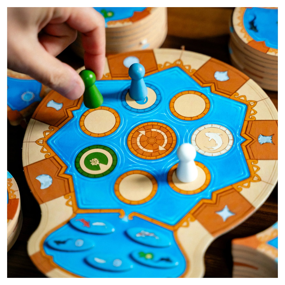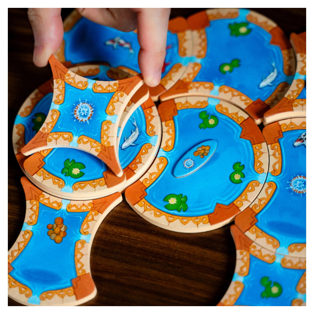När någon landar på den gröna, blå eller vita rutan med matchande färgad bricka får alla poäng för det länkade föremålet: näckrosblad, separata pooler sammanlänkade med konstant vattenflöde och fisk. För varje föremål får du 1, 2, 3, etc. poäng om föremålet är på den första, andra, tredje, etc. nivån.