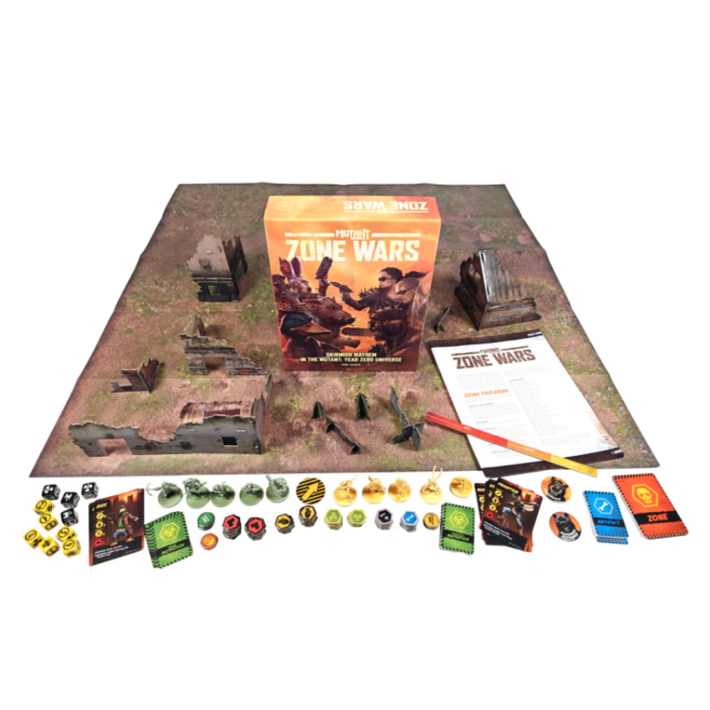 Dessutom ingår kort för karaktärer, artefakter, zonhändelser och mutationer, en komplett uppsättning Year Zero-tärningar, polletter, linjaler och en uppsättning kartongterräng och en spelmatta. Ingen montering behövs!