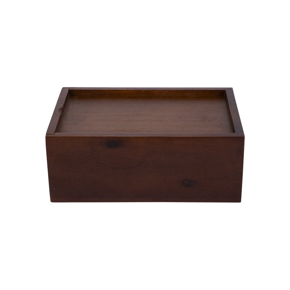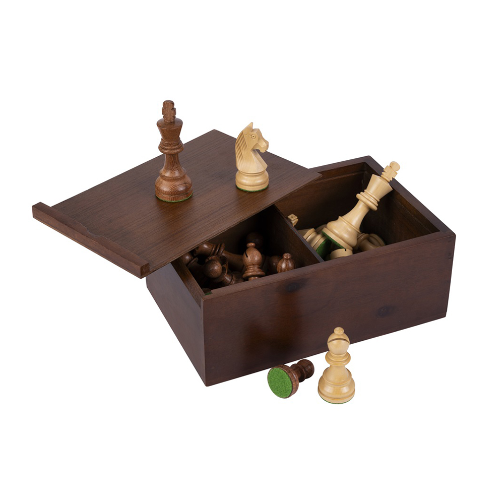 Pjäserna levereras med stilren trälåda med skjutlock för förvaring.