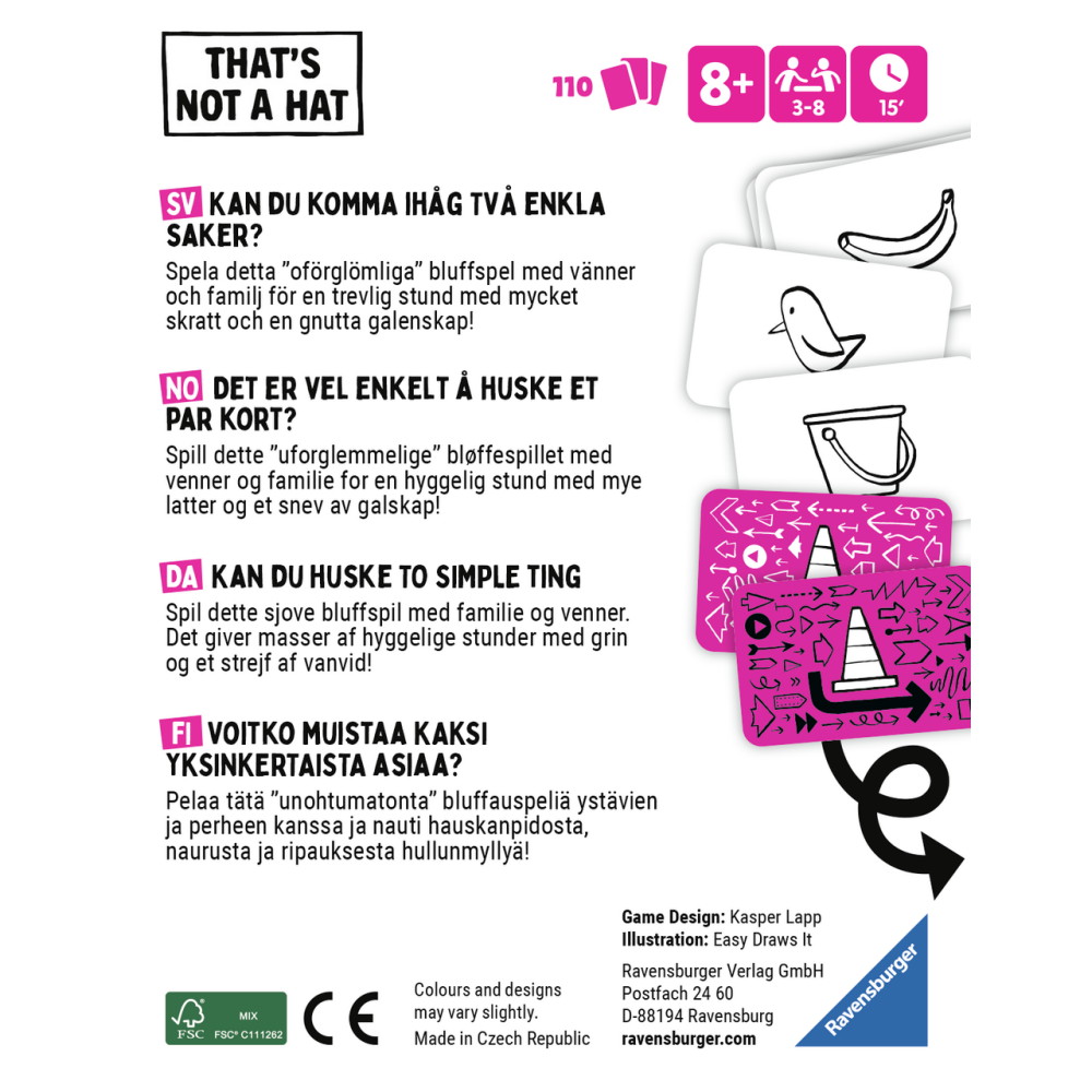 That's Not A Hat är ett bluffspel där spelarna ska ta emot och ge bort föremål. Det enda problemet är att när du ger presenten vidare så ofta glömmer du ibland vad du ger bort! Bluffa om vad du ger bort och du kanske lyckas, men om din presentmottagare inte tror dig, kan du sluta med ett straff. När en spelare har tre straffpoäng räknar alla sina straffpoäng och den spelare som har minst poäng vinner!