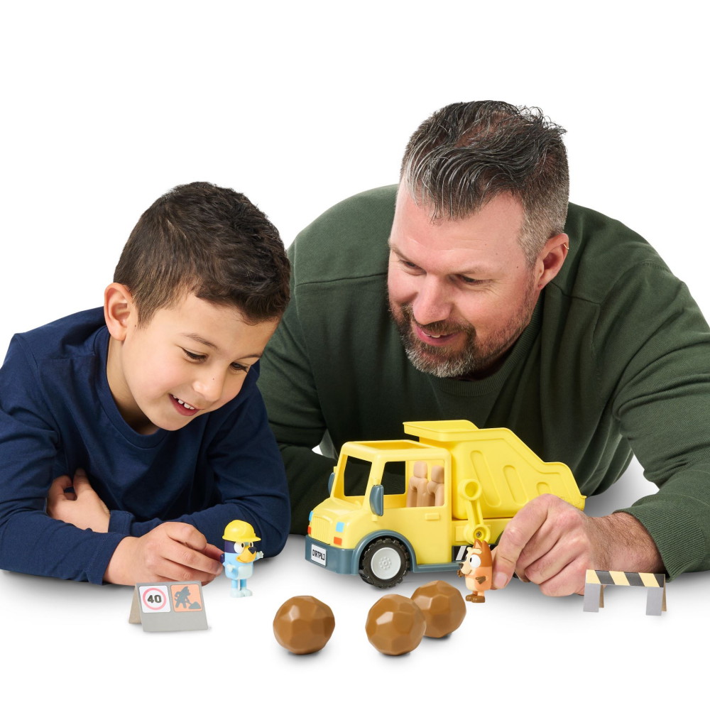Blueys Tippvagn, med exklusiva Hard-Hat Bluey och Muddy Bingo figurer.
