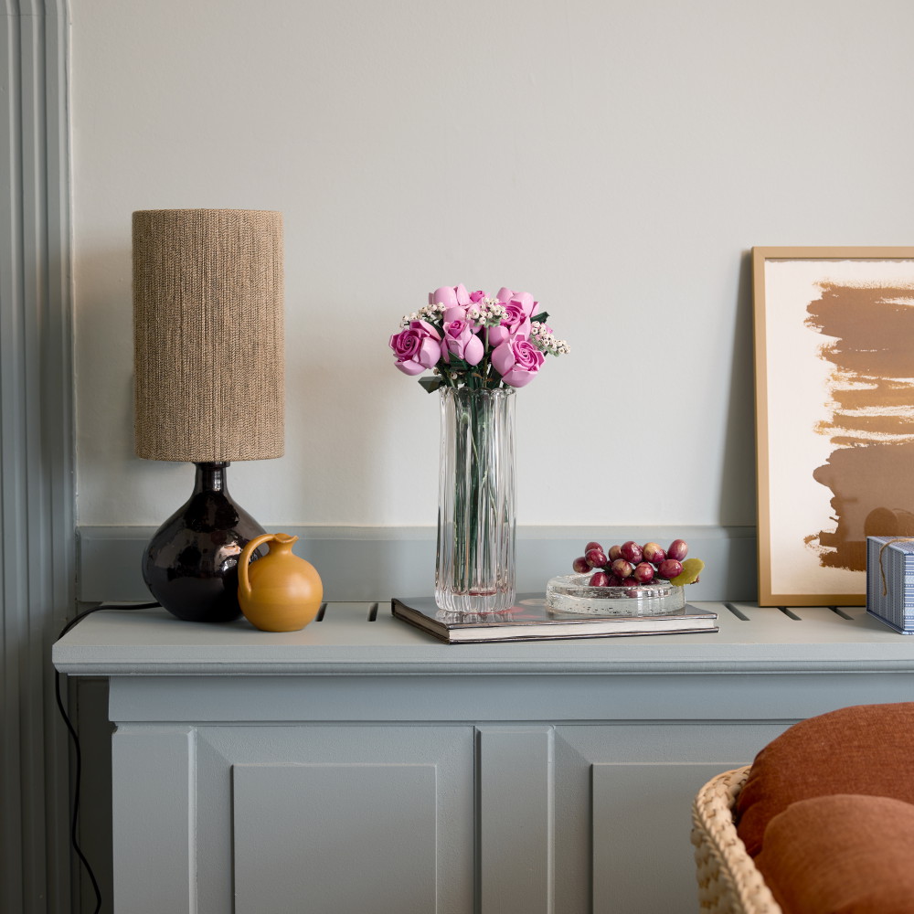 Skapa ett elegant klossbyggt blomsterarrangemang och förundras över dess rosiga detaljer.