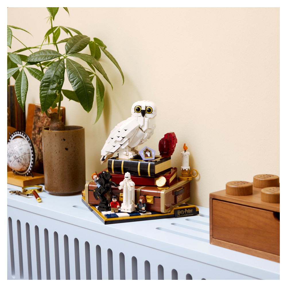 Skapa den första LEGO figuren av fjällugglan Hedwig med slutna vingar och visa upp henne bredvid De vises sten ovanpå Harry Potters koffert. Lägg till 3 LEGO Harry Potter minifigurer – Harry Potter, Hermione Granger och Ron Weasley – och föremål som ett chokladgrodskort och ett trollkarlsschackspel.