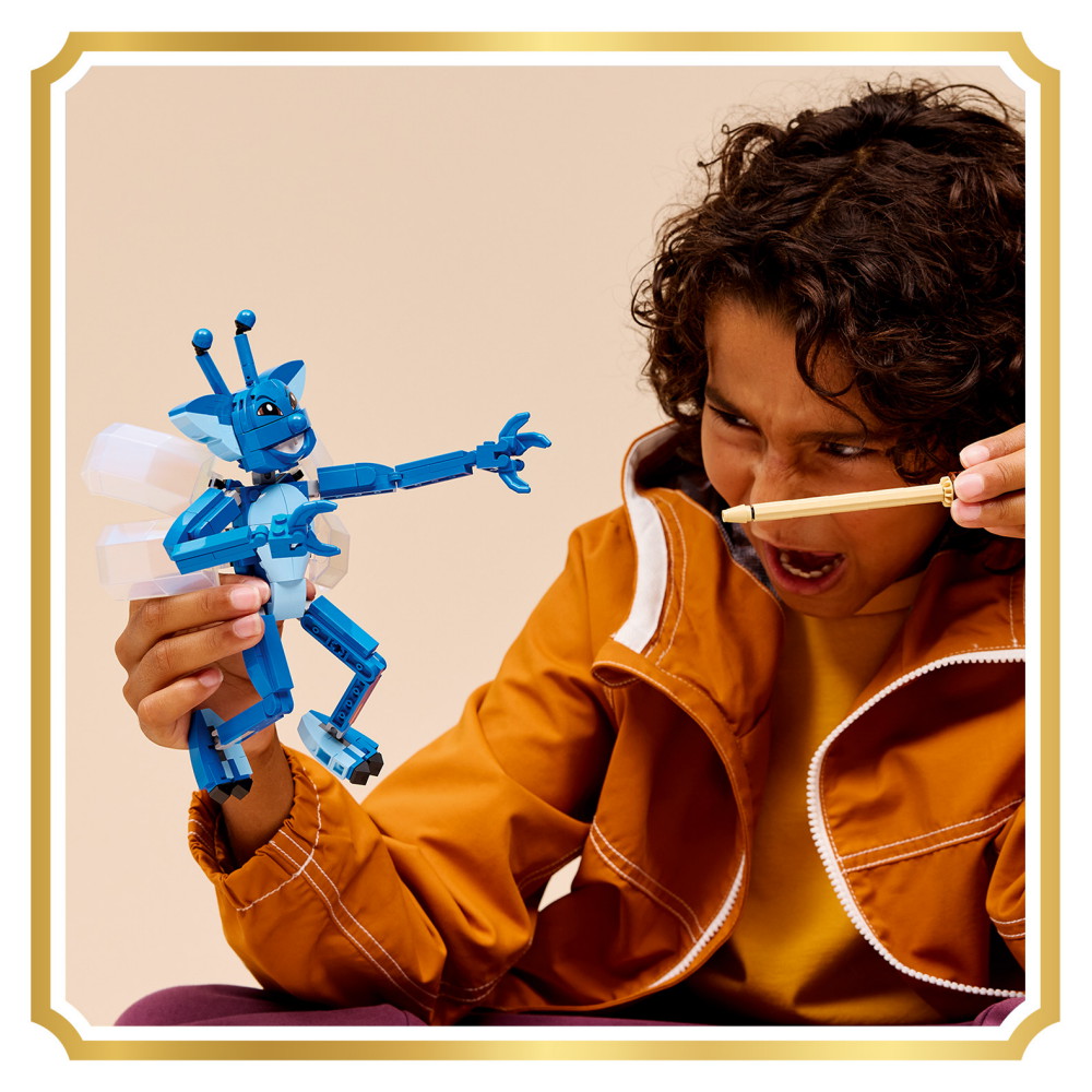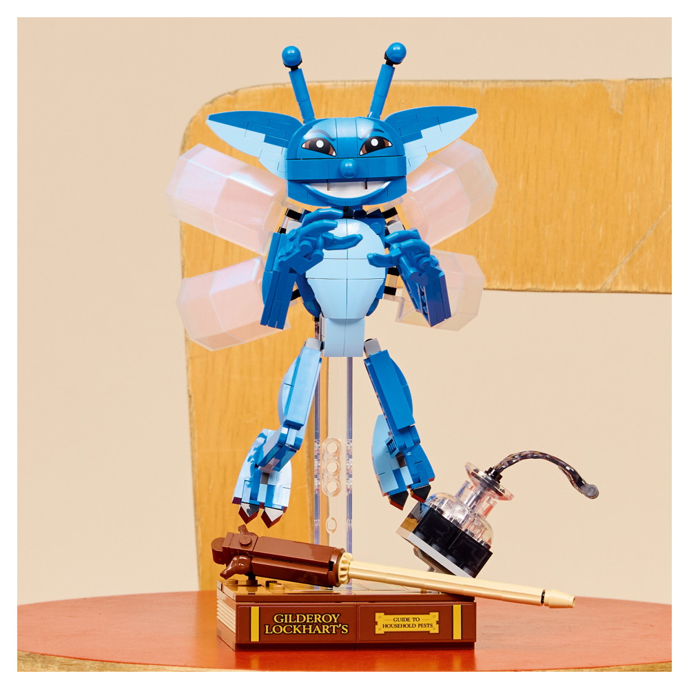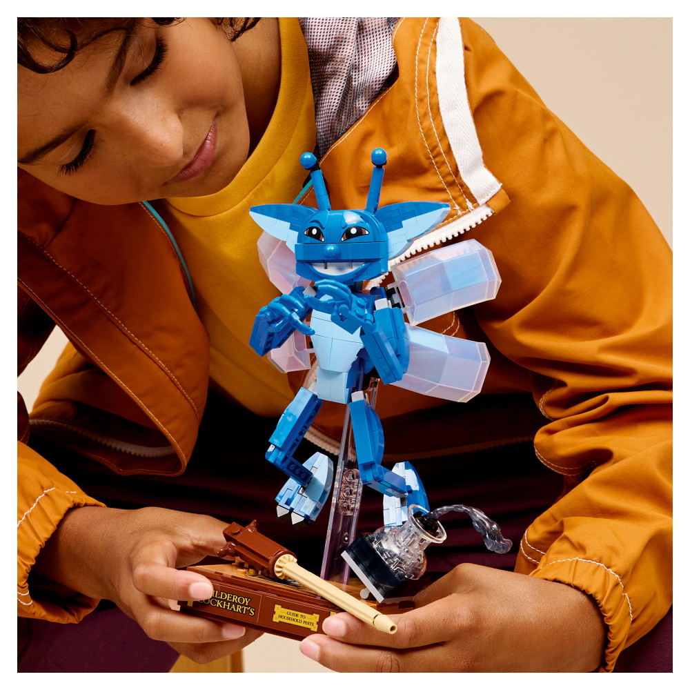 Ställ pixiegnomen i flygande position på det genomskinliga visningsstället, eller placera den i stående position och lek med den på egen hand. Denna byggleksak för barn har även ikoniska tillbehör: visa upp pixiegnomen med den byggbara boken av Gyllenroy Lockman och bläckflaskan som håller på att välta.