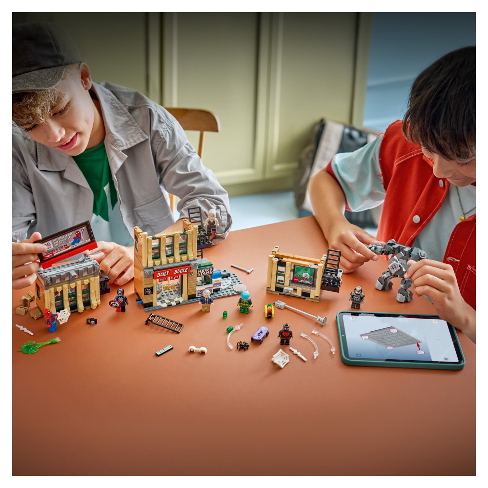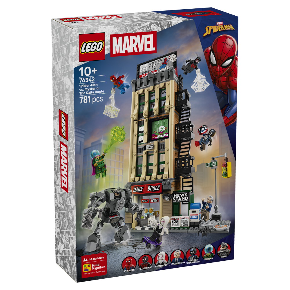 LEGO | Marvel byggleksaken med Daily Bugle innehåller minifigurerna Spider-Man, Miles Morales, Ghost-Spider, J. Jonah Jameson, Mysterio, venomifierad Captain America och Rhino, plus 3 genomskinliga pinnar och 2 genomskinliga klossar för att möjliggöra action i luften. Det finns också en ledad Rhino-robot med öppningsbar cockpit. Insidan är detaljerad, med kontor, reception, nyhetsrumsteknik, kassaskåp och en spak för att ändra skylten. Utanför finns en brandutgång, ett flyttbart tidningsställ och ett gathörn med trafikljus. Ladda ner appen LEGO Builder för samarbetsupplevelsen Bygg Tillsammans med vänner och familj. Byggsetet innehåller 781 delar.