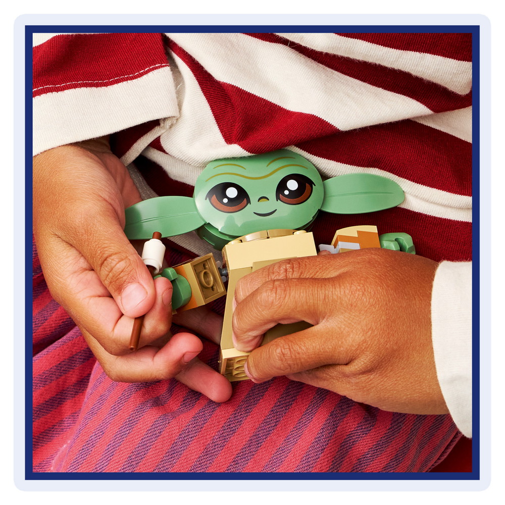 Kasta iväg sorgan-grodan med katapulten. Återskapa scener kring eldstaden från Star Wars: The Mandalorian med en gryta, 2 tentakler, en marshmallow på en pinne och 2 blå makroner. En av makronerna får plats i Grogus mage.