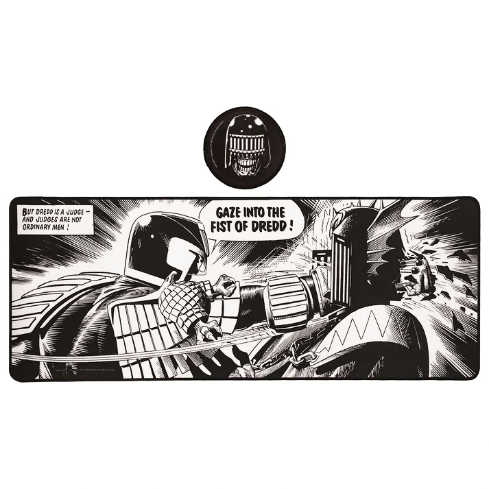Desk paden (800 x 300 x 3 mm) har en mikrotexturerad tygovansida för smidig precision, förstärkta kanter för extra hållbarhet och en halkfri gummibas som håller den stadigt på plats. Det matchande underlägget (100 mm i diameter) är tillverkat i samma material och pryds av Judge Death – den perfekta motpolen till Dredd.