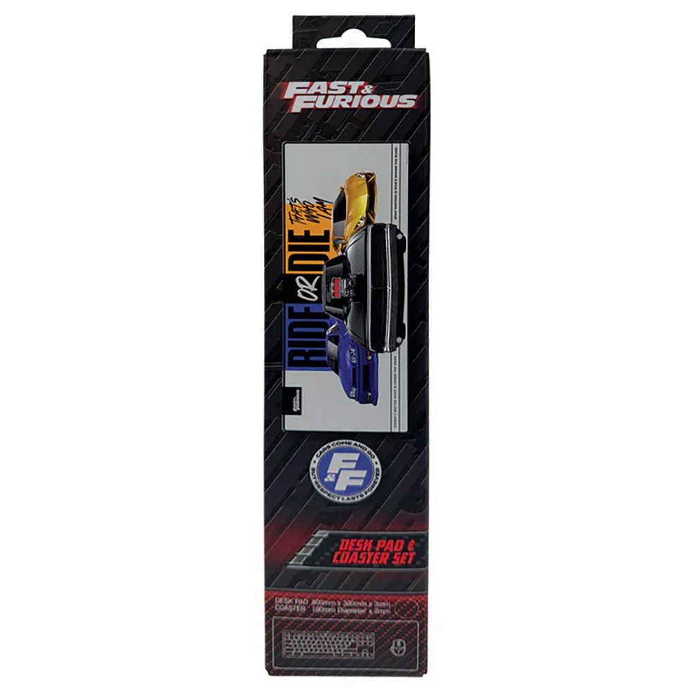 Gasa upp arbets- eller gamingytan med detta “Ride or Die” Desk Pad & Coaster Set. För dig som älskar högpresterande design och ikoniska bilar från filmens värld pryds både desk paden och underlägget av tre legendariska bilar – redo att ta plats på din desktop.