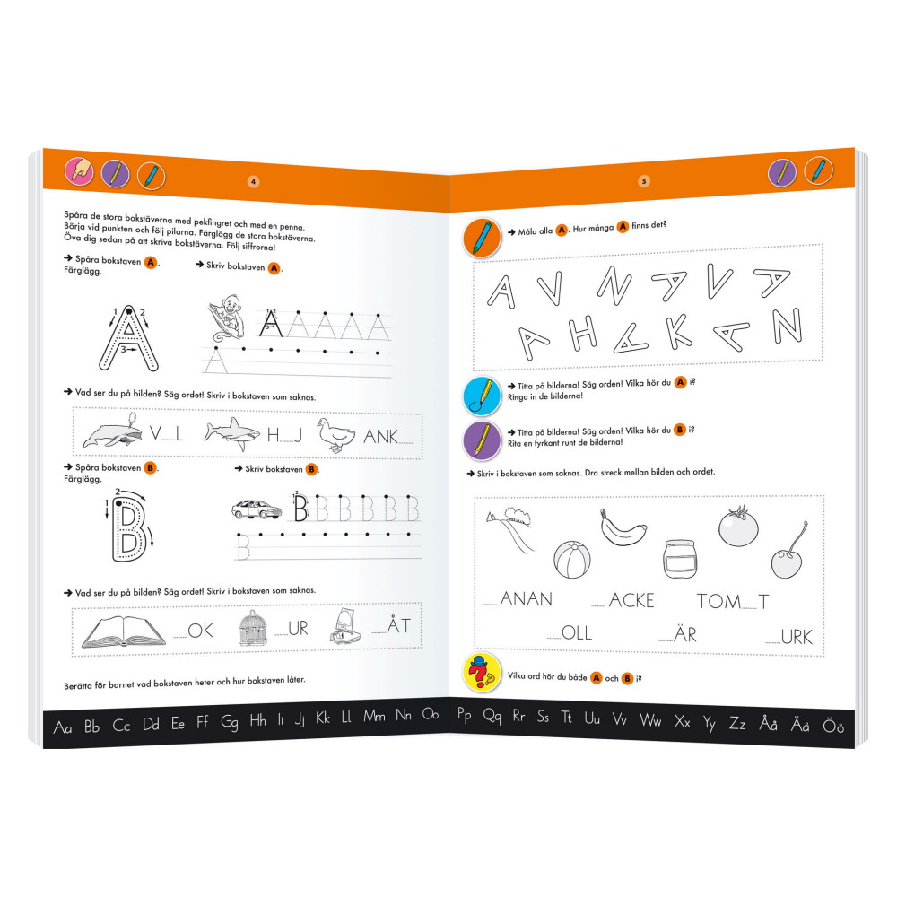 I boken får barnet träna på att skriva de stora bokstäverna. Orden som barnet får träna på är ljudenligt stavade - bokstäverna skrivs som de låter.