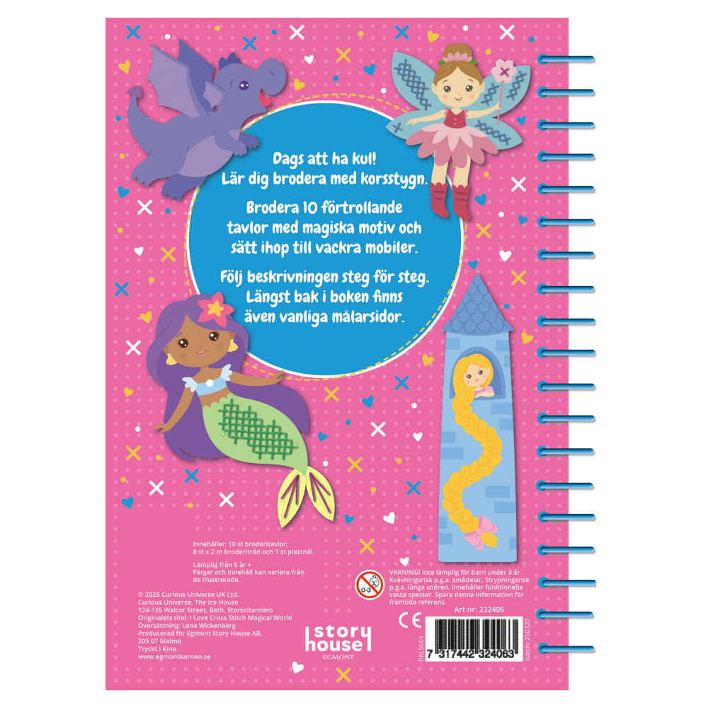 Innehåller 10 broderitavlor, 8 broderitrådar (2m) och 1 plastnål.