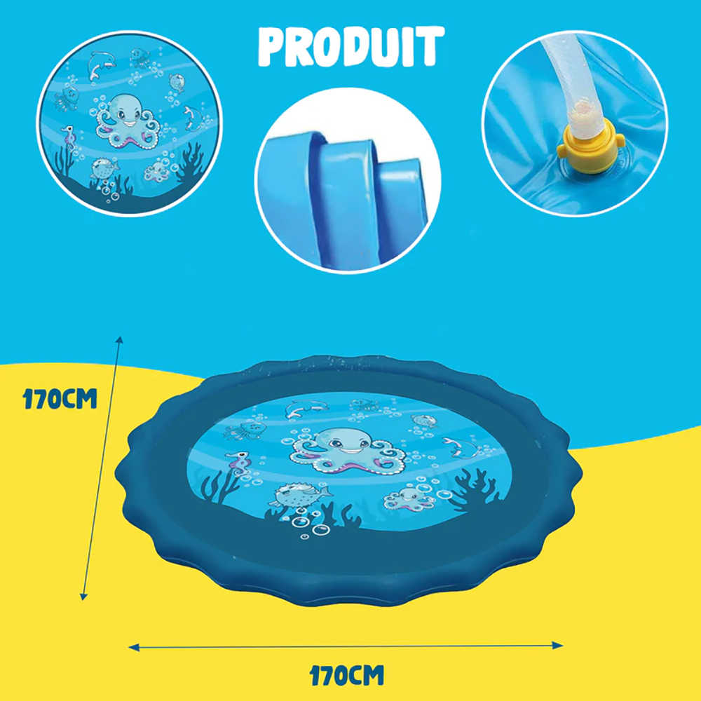 Koppla enkelt in vattenslangen – sedan är det bara att hoppa rakt in i plasket! Små fontäner sprutar upp runt hela mattan och skapar en magisk vattenring som barn (och barnsliga vuxna) inte kan få nog av.