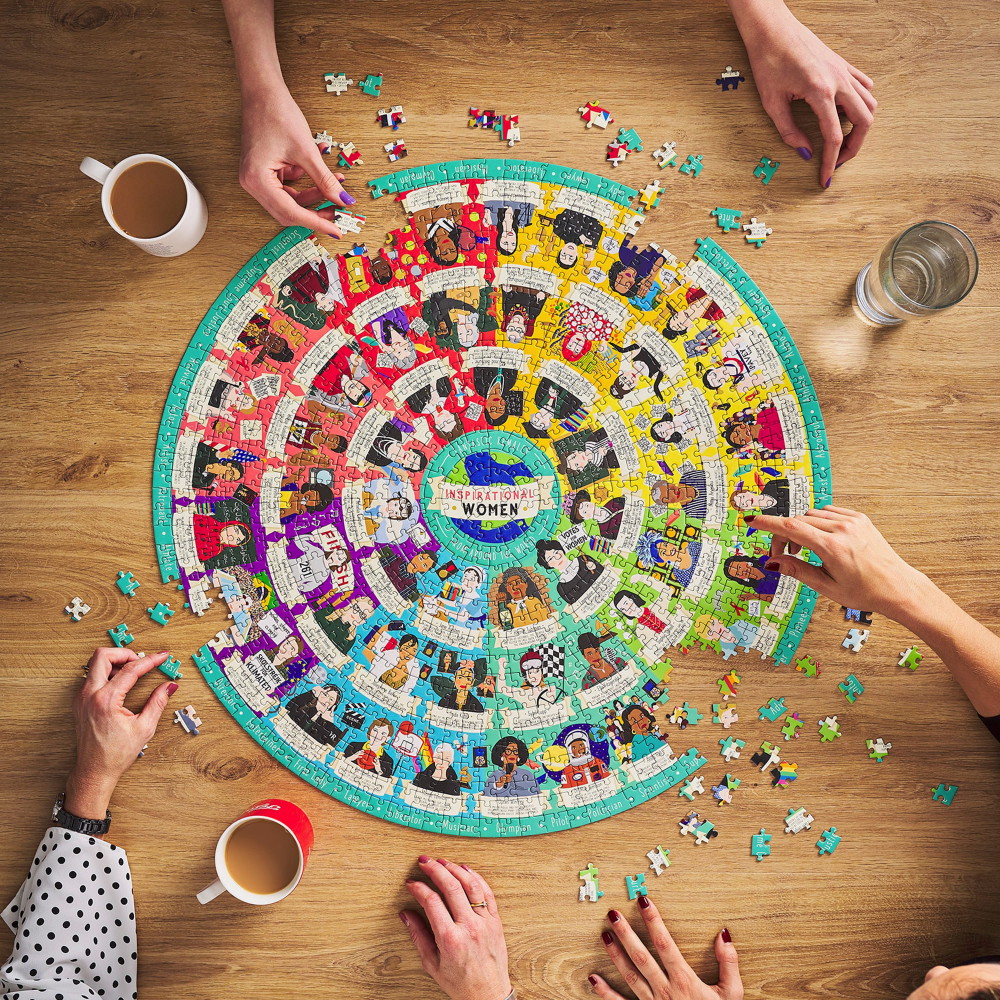 Runt pussel med illustrerade bilder och information om 54 inspirerande kvinnor från hela världen!