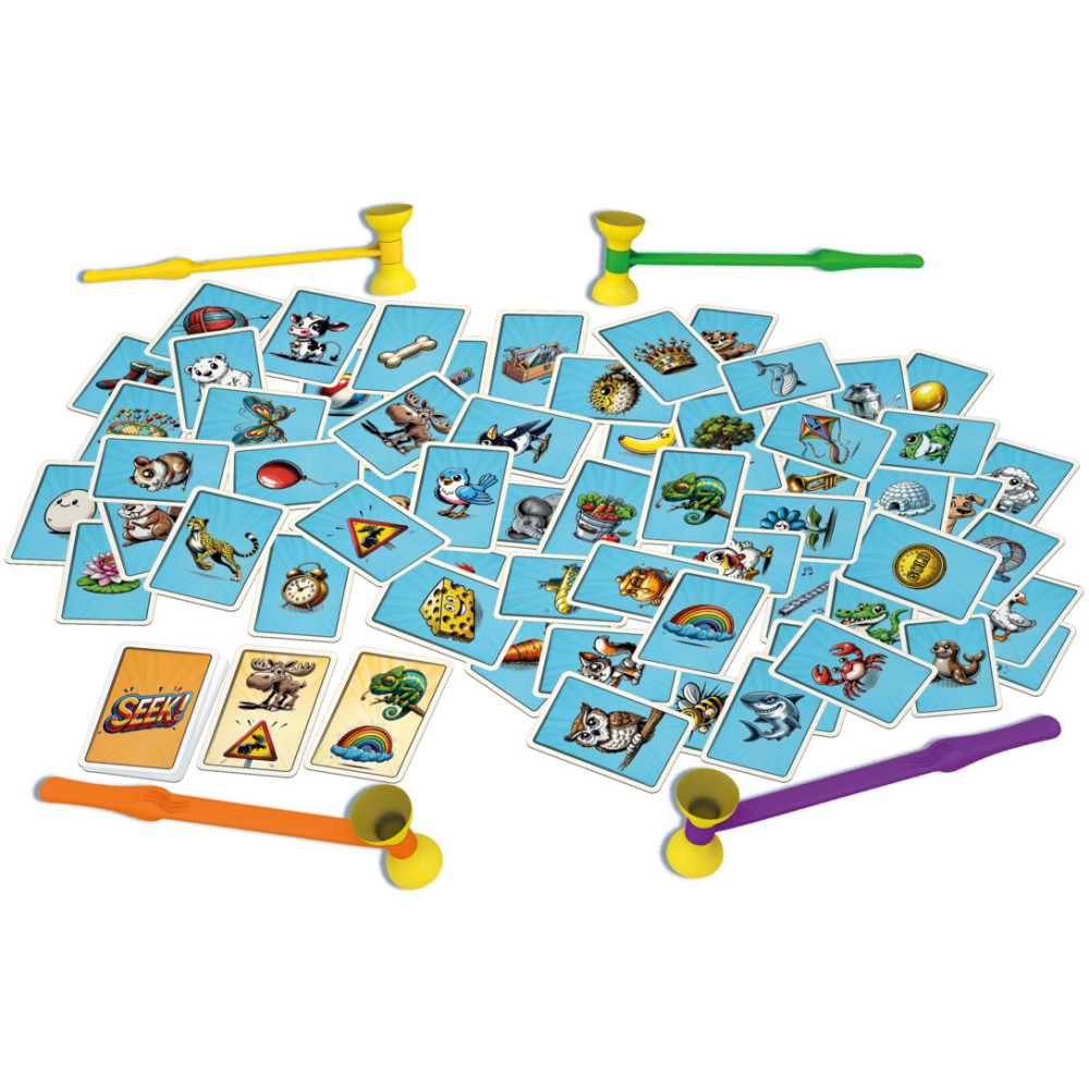Innehåll: 36 SEEK!- kort, 74 FIND!-kort, 4 Hazzle-klubbor och regler.