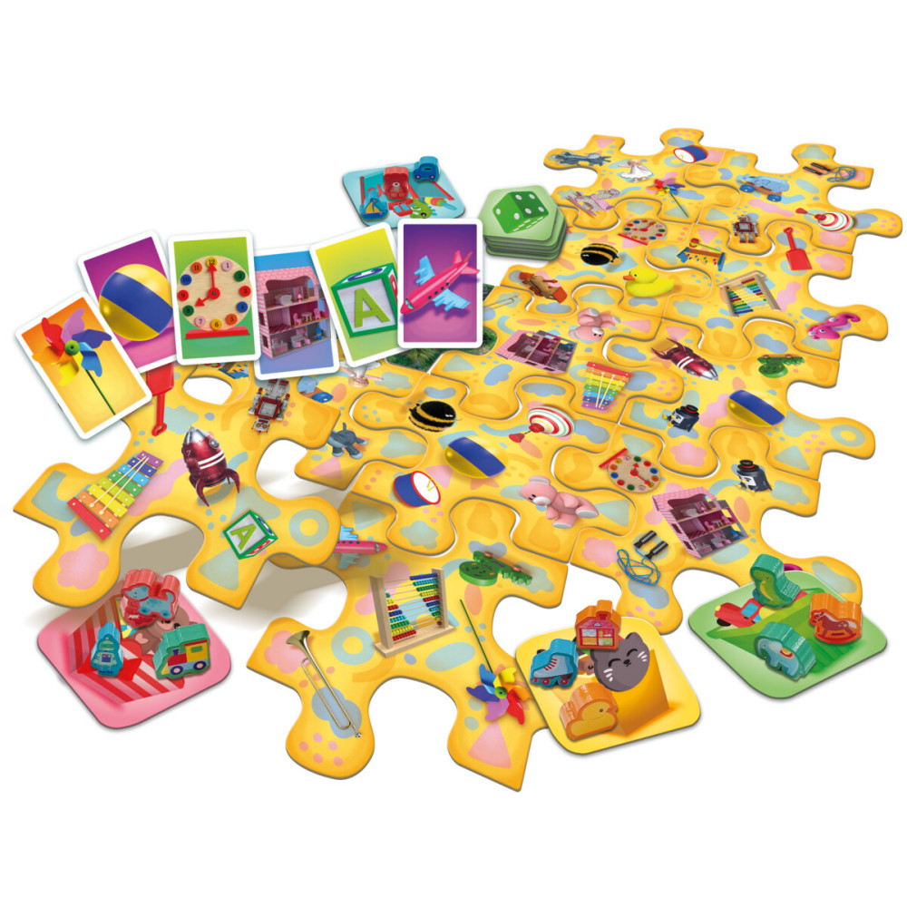 12 spelplansbitar, 55 kort, 4 leksakslådeplattor, 13 leksaksfigurer i trä, 5 bonusbrickor och regler.