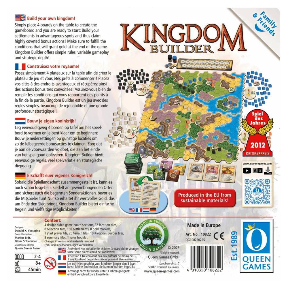 I Kingdom Builder: Family & Friends bygger du bosättningar utifrån de kort du spelar, samtidigt som du anpassar dig till spelplanens föränderliga landskap. Genom att placera dina byggnader strategiskt och utnyttja specialförmågor kan du skapa effektiva drag och överlista dina motståndare. De varierande målen gör att du alltid måste tänka om och hitta nya vägar till poäng.