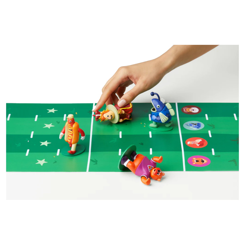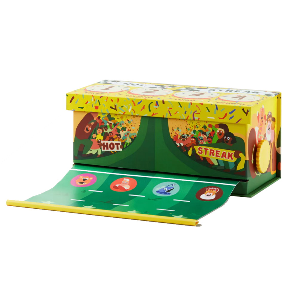 Blanda leken, bränn tre kort och visa sedan korten ett efter ett från leken, flytta maskotarna längs banan, där de ibland svänger in i en annan fil och välter en annan racer, ibland vänder sig om, ibland rör sig alla på en gång och ibland bara går baklänges! Om en löpare springer av banan eller skulle bli vält när den redan har fallit diskvalificeras de. Om det behövs, blanda alla kort i kortleken, bränn tre kort igen och fortsätt tävla tills alla platserna på prispallen är fyllda. Betala ut insatser baserat på dessa resultat.