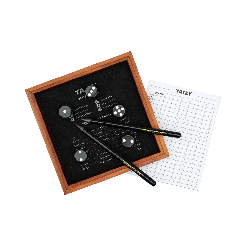 Setet innehåller högkvalitativa tärningar, poängblock och en premiumförvaringslåda i Iron & Glorys karakteristiska eleganta stil. Kompakt, slitstarkt och redo att följa med både på resor och till hemmets spelbord.