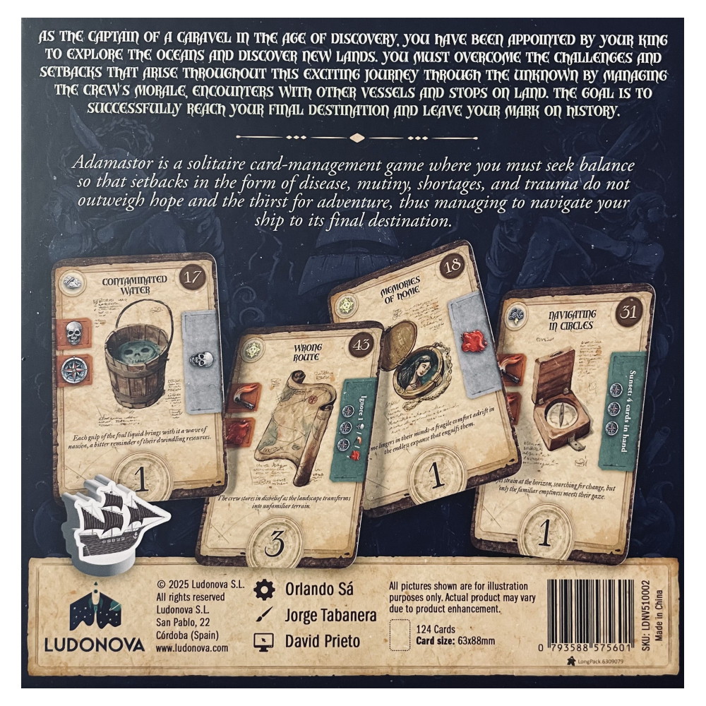 Adamastor är ett strategiskt kort- och tableau-spel där dina kort har flera användningsområden. Du balanserar resurser, moral och risker samtidigt som oförutsägbara händelser slår till baserat på dina val. Stormar rasar, vinden vänder och pressen på din besättning ökar – men med rätt strategi kan du vända motgång till framgång.