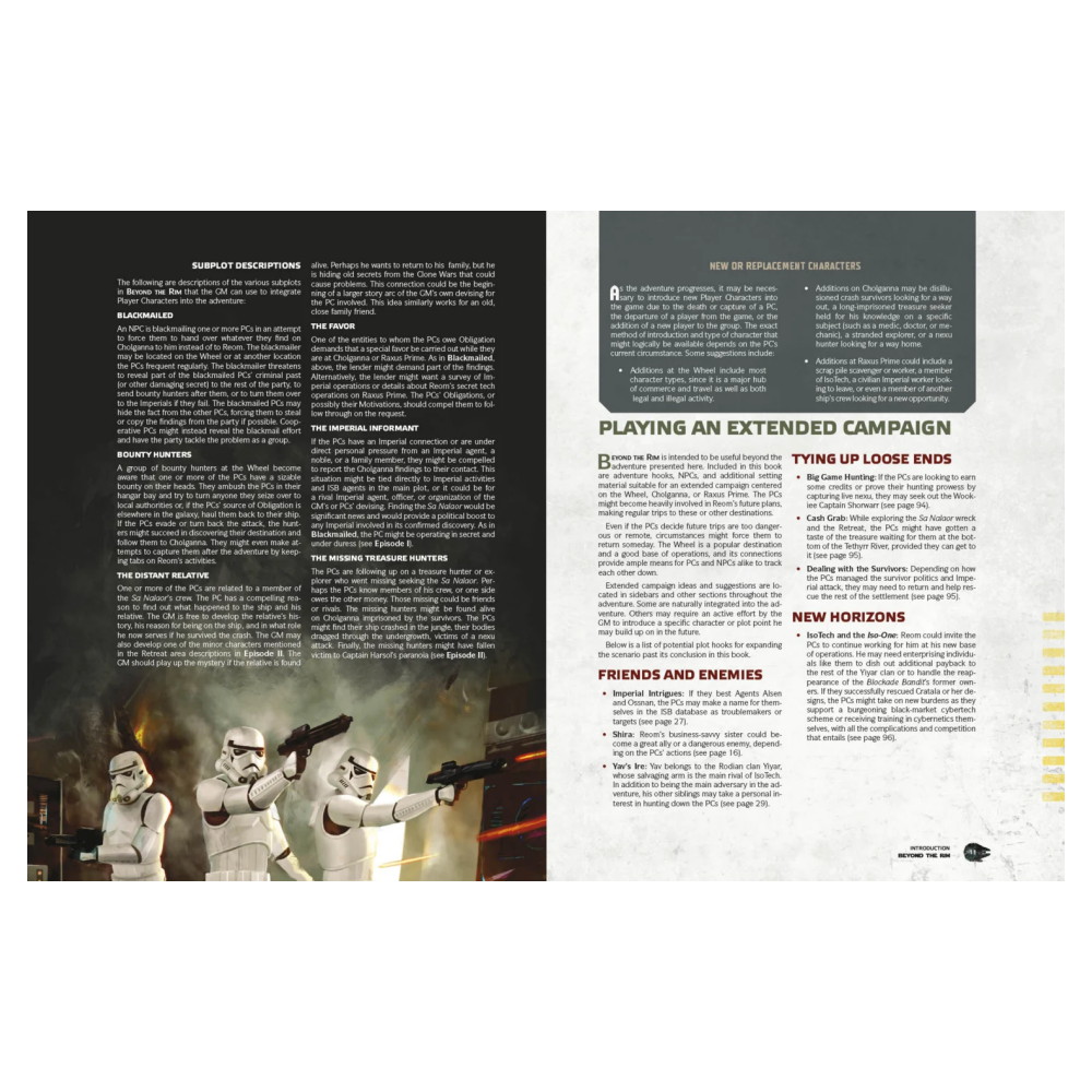 Star Wars: Edge of the Empire – Beyond the Rim är ett omfattande äventyr där spelarna följer spåren efter det mystiska skeppet Sa Nalaor. Under resans gång möter gruppen rivaler, farliga miljöer och hemligheter som legat begravda sedan Klonkrigen.