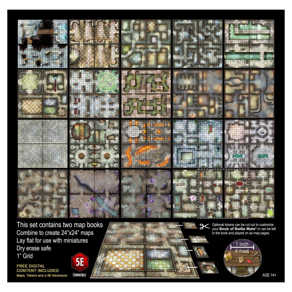 De två kartböckerna erbjuder en enorm variation av miljöer – från fällfyllda gravar till mörka ritualkammare och slingrande kloaker. Tack vare den smarta designen kan du kombinera sidor fritt och skapa sömlösa spelområden som anpassas efter din berättelse. Rita till egna detaljer, ändra layouten under spelets gång och låt världen växa organiskt tillsammans med spelarna.