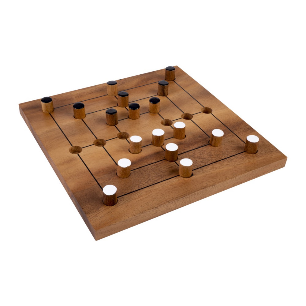 Målet är att få tre pjäser i rad - vågrätt eller lodrätt. Tre pjäser i rad kallas en kvarn. När man bildat en kvarn, får man ta bort en av motspelarens pjäser. Spelet är förlorat när man har mindre än tre pjäser, och ej längre kan bygga någon kvarn. Ett lätt spel att lära sig, men det bjuder även på ett väldigt strategiskt djup. Brädspelet är av ekologiskt akaciaträ.