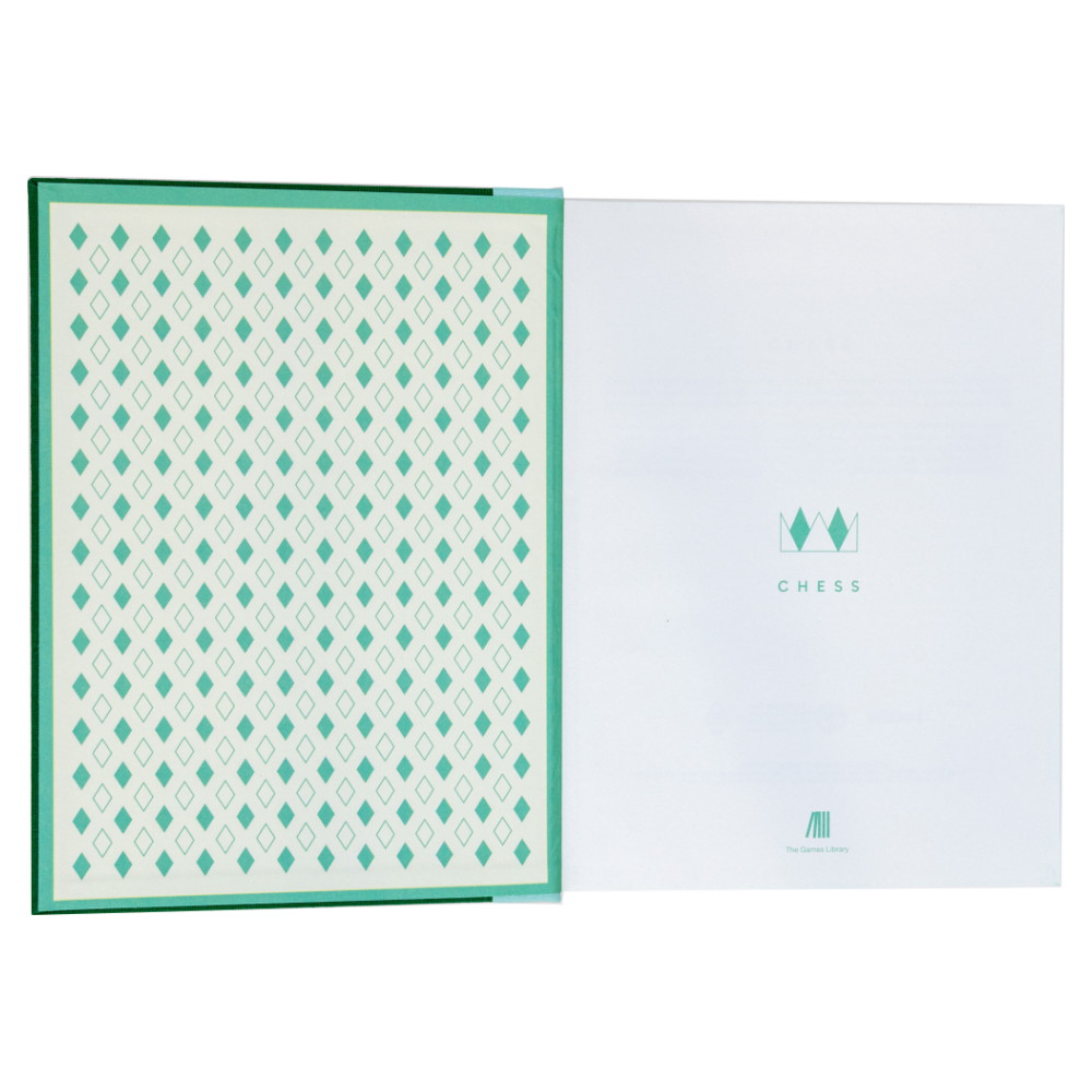 Öppna denna inbundna bok och upptäck ett schackbräde och spelpjäser från The Game Library.