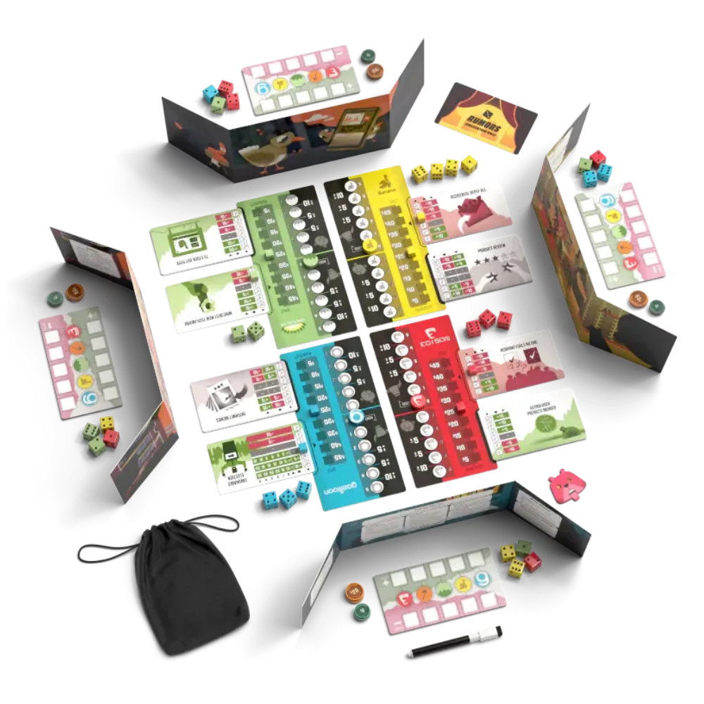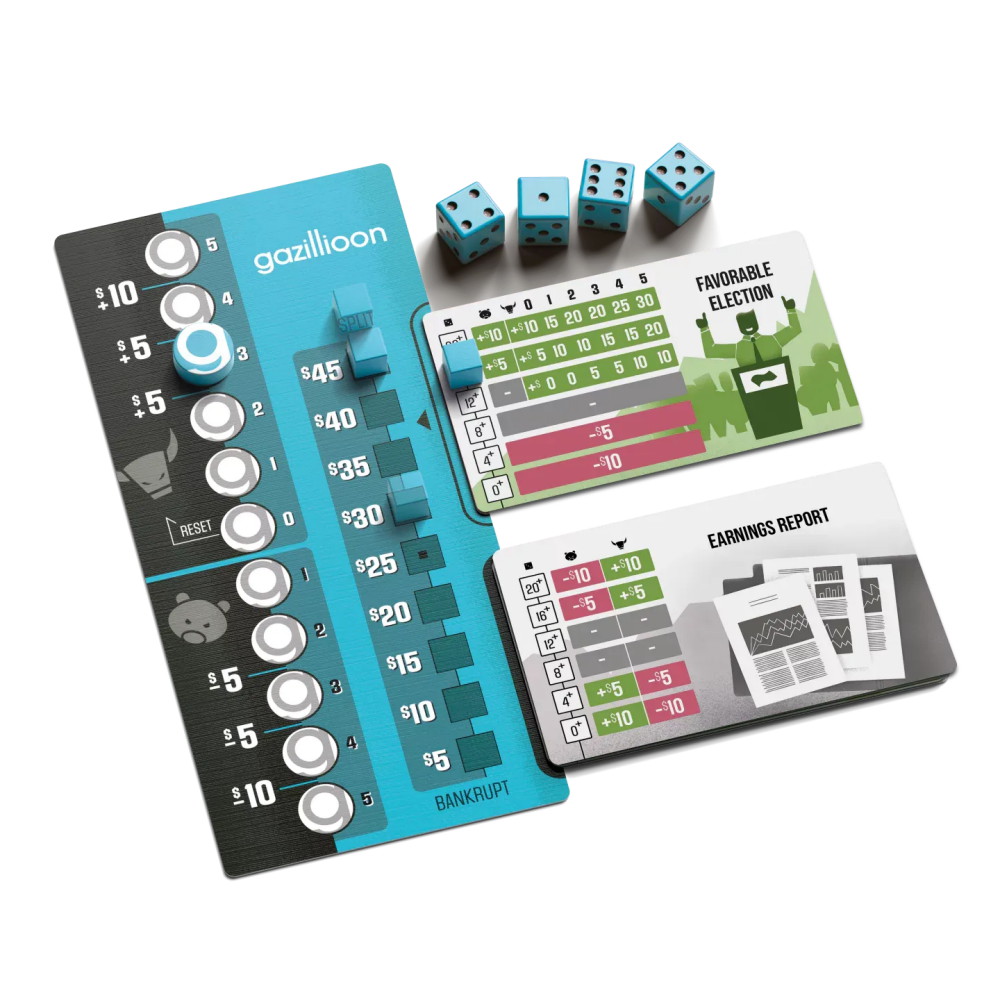 Händelsekort med smarta nyhetsrubriker avgör hur varje aktie förändras. Använd (och manipulera!) de 42 tärningarna med smart spel för att påverka marknaden.