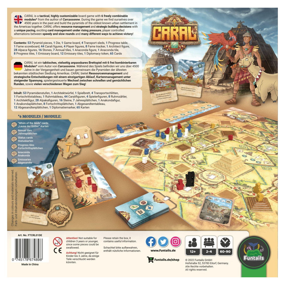 Caral kommer att överraska dig med en fräsch spelupplevelse! Det som börjar väldigt enkelt, utvecklas förvånansvärt komplext. Till exempel ger alpackor och resurskort dig mer flexibilitet på spiralbanan. Men att offra värdefulla kort i den årliga ceremonin kan ge dig stora fördelar gentemot medspelare. Allt är en fråga om taktik!