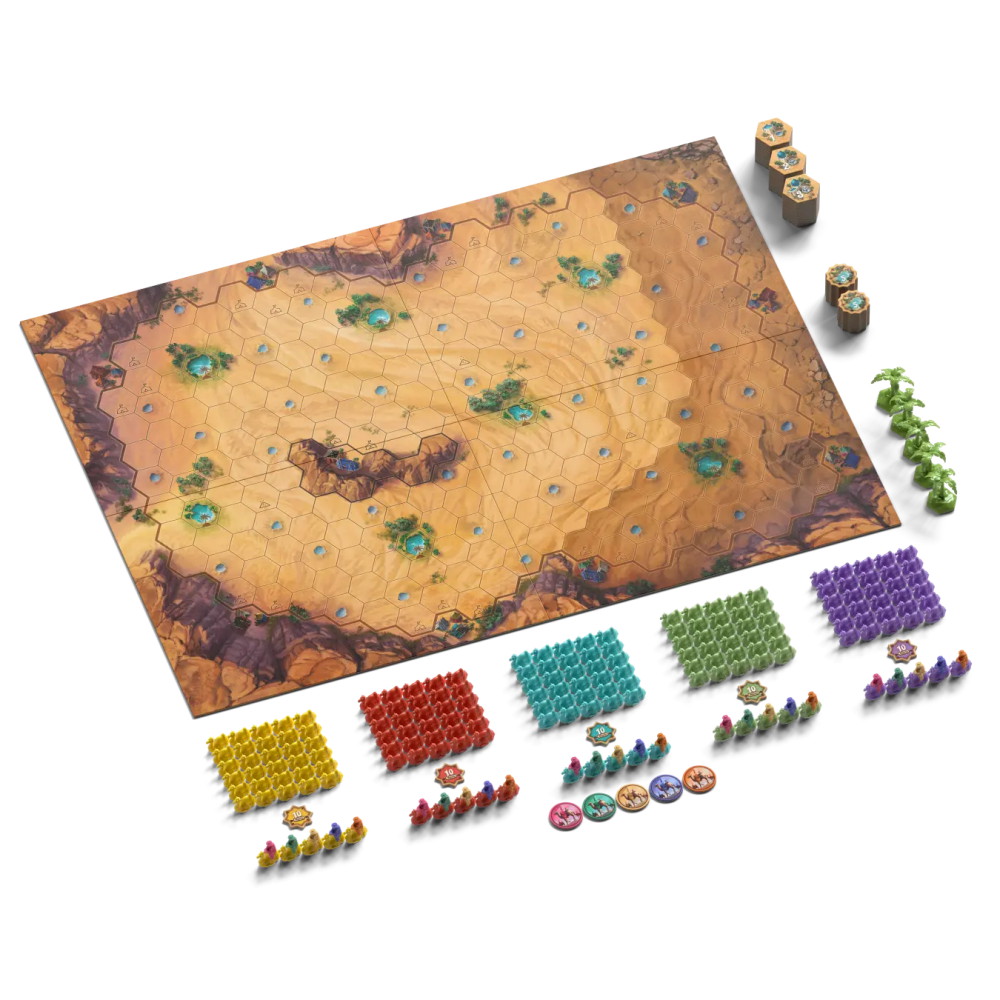 Strategi är avgörande för att bestämma hur och var du ska bygga din stams karavaner. Det finns flera sätt att få poäng och flera sätt att vinna. Ska man försöka bygga den längsta husvagnen? Eller ska du dominera öknens oaser? Glöm inte att hålla ett öga på dina motståndares husvagnar, annars kan du hitta din egen stam avskuren från värdefulla vattenhål.