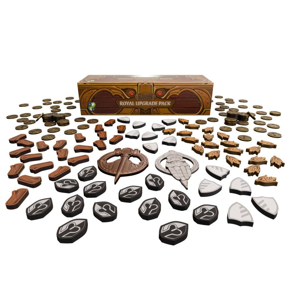 Royal Upgrade Pack för The Queen’s Dilemma förvandlar spelets komponenter till något betydligt mer påtagligt och elegant. Trämarkörer med silkscreentryck ersätter standarddelar och ger en varm, taktil känsla, medan metallkomponenter med antik finish tillför både tyngd och visuell prakt.